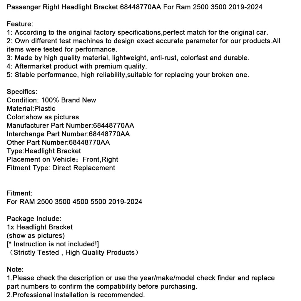 Passenger Right Headlight Bracket 68448770AA Fit For Ram 2500 3500 2019-2024