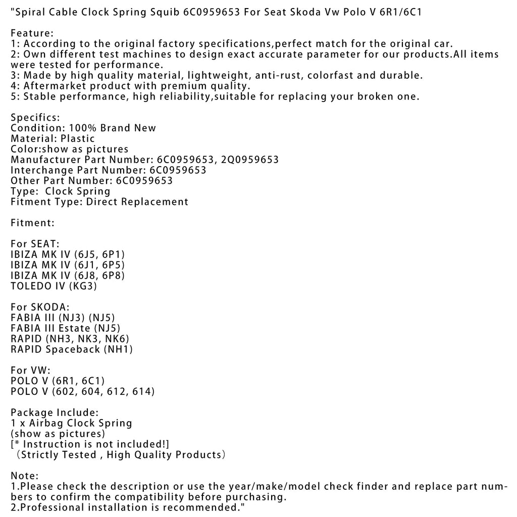 Spiral Cable Clock Spring Squib 6C0959653 For Seat Skoda Vw Polo V 6R1/6C1