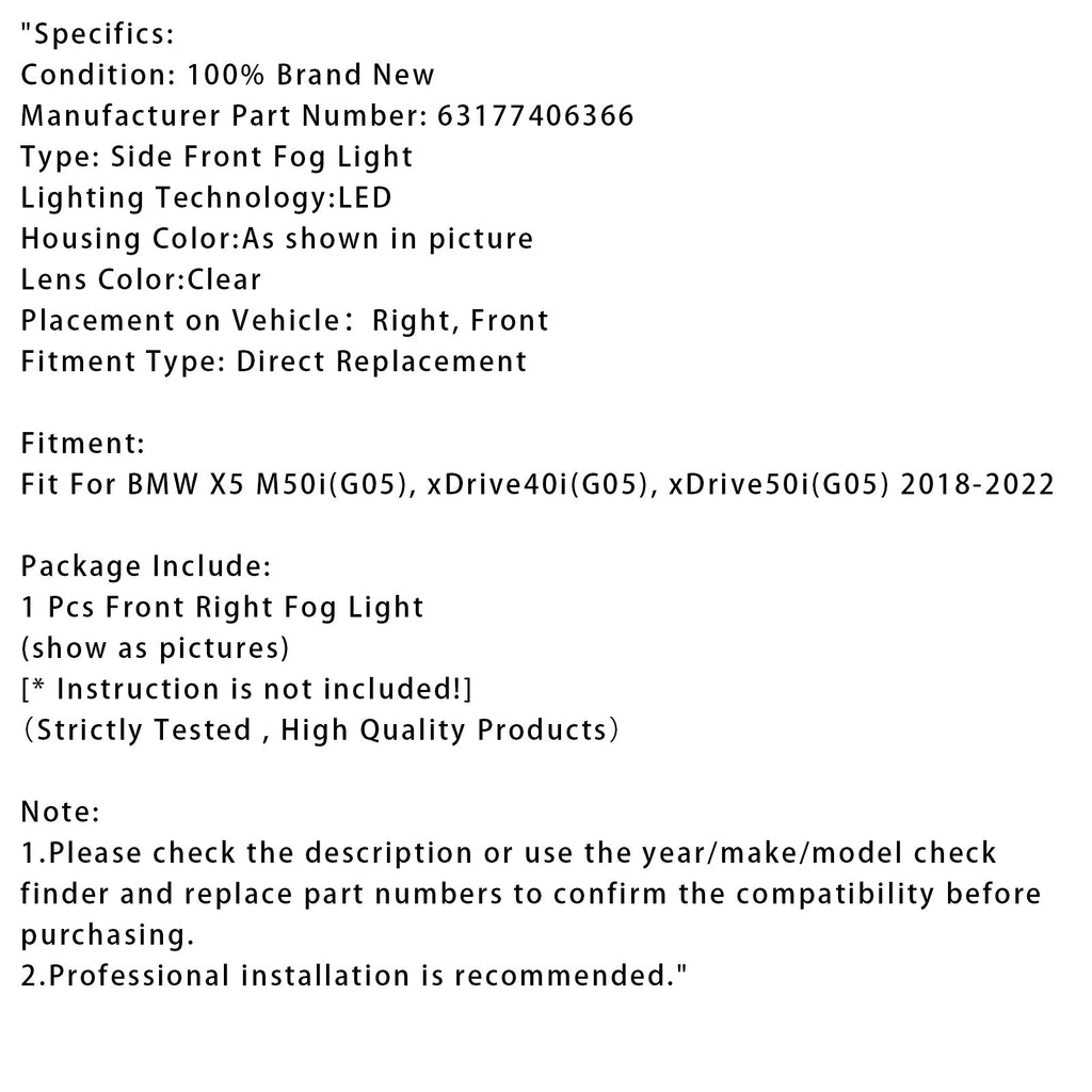 1 Pcs LED Front Right Fog Light For BMW X5 G05 2018-2022 63177406366