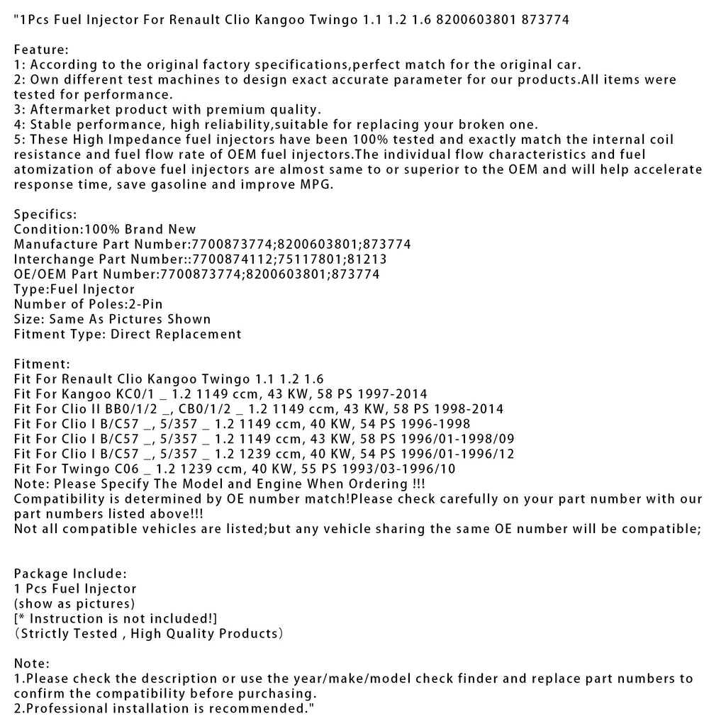 1Pcs Fuel Injector For Renault Clio Kangoo Twingo 1.1 1.2 1.6 8200603801 873774
