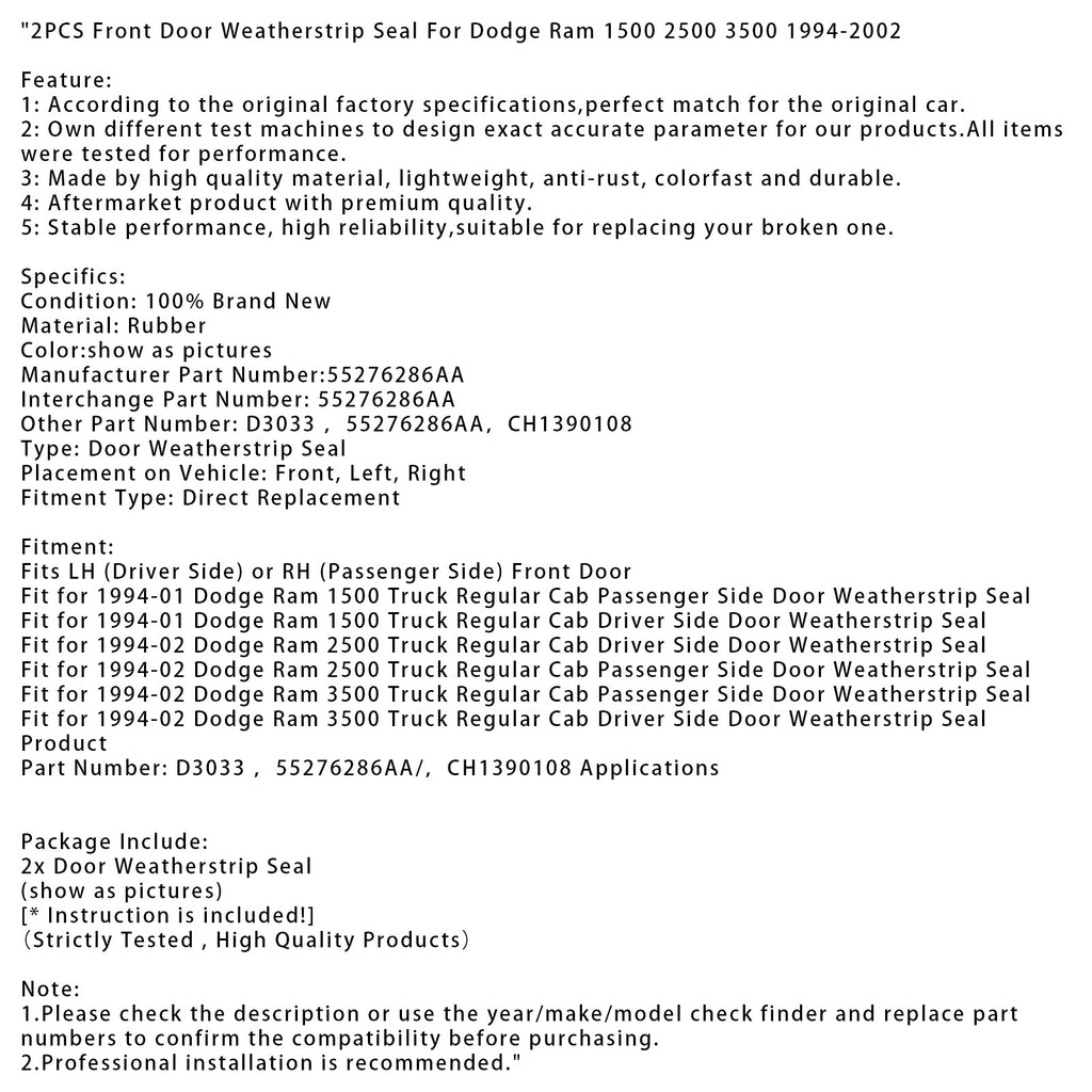 Fit for 1994-02 Dodge Ram 3500 Truck Regular Cab Driver Side Door Weatherstrip Seal Product