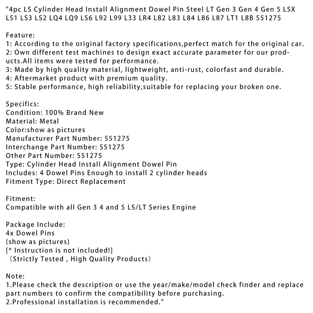 4pc LS Cylinder Head Install Alignment Dowel Pin Steel LT Gen 3 Gen 4 Gen 5 LSX LS1 LS3 LS2 LQ4 LQ9 LS6 L92 L99 L33 LR4 L82 L83 L84 L86 L87 LT1 L8B 551275