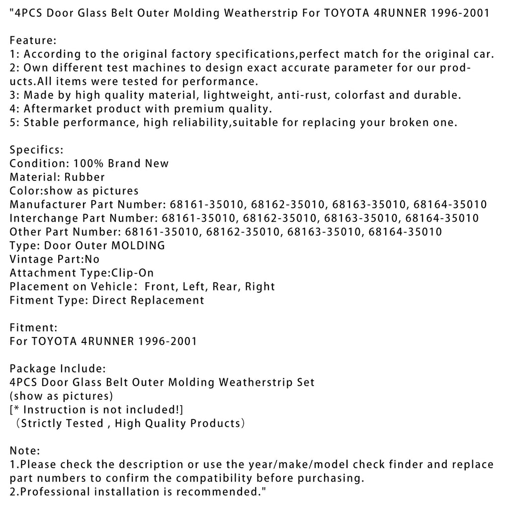 1996-2001 TOYOTA 4RUNNER 4PCS Door Glass Belt Outer Molding Weatherstrip