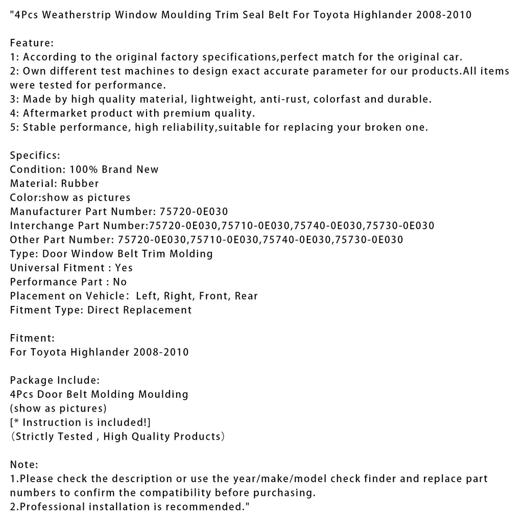2008-2010 Toyota Highlander 4Pcs Weatherstrip Window Moulding Trim Seal Belt