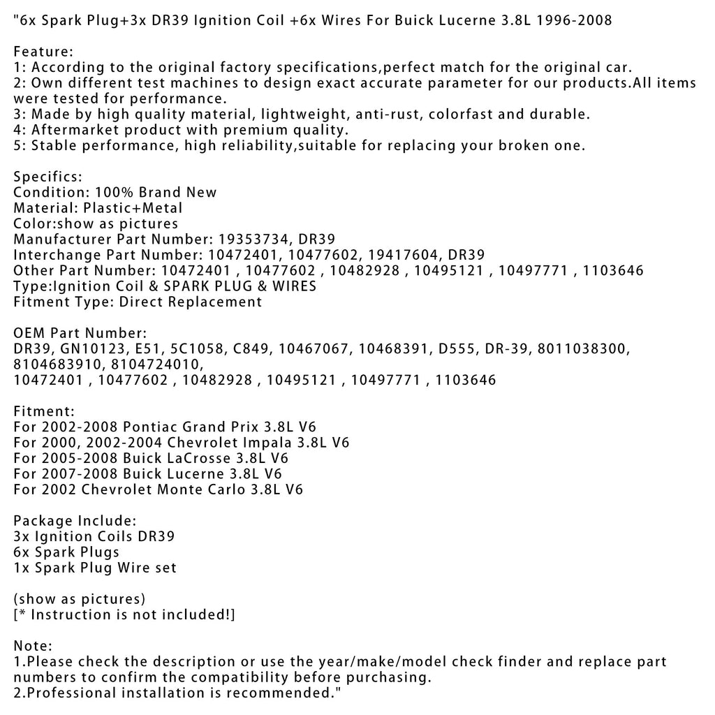 6x Spark Plug+3x DR39 Ignition Coil +6x Wires For Buick Lucerne 3.8L 1996-2008