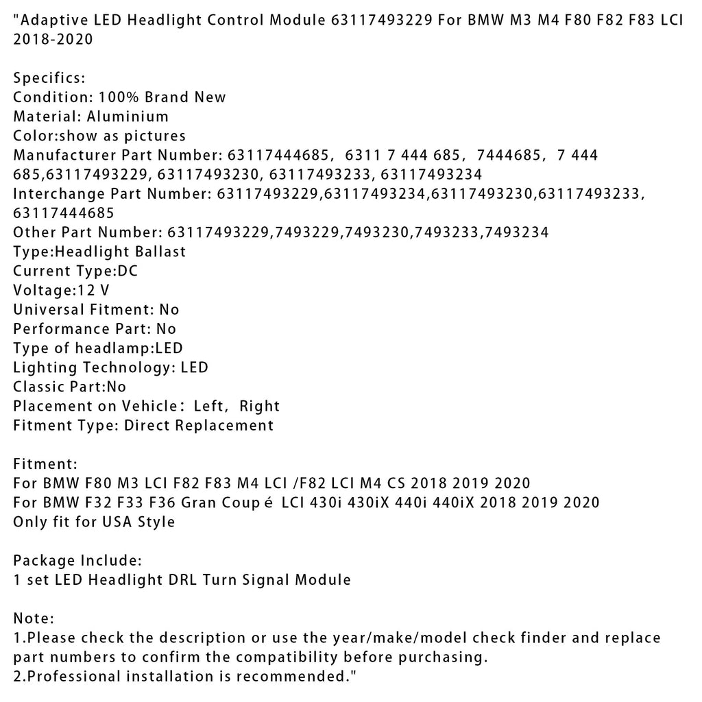 Adaptive LED Headlight Control Module 63117493229 For BMW M3 M4 F80 F82 F83 LCI 2018-2020