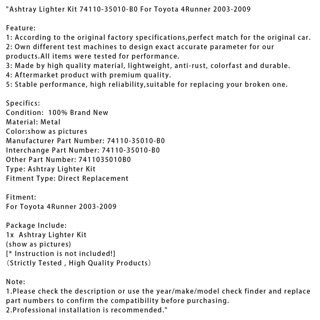 Ashtray Lighter Kit 74110-35010-B0 For Toyota 4Runner 2003-2009