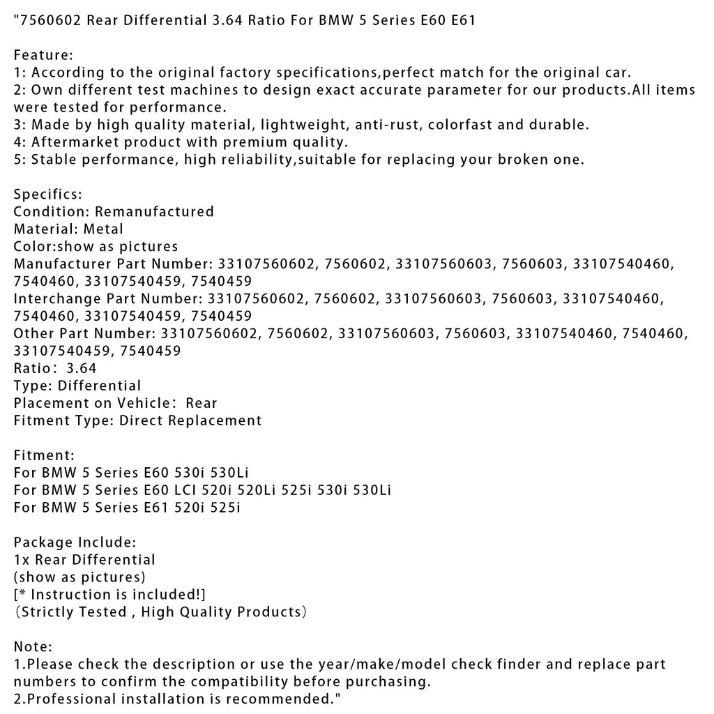 BMW 5 Series E60 LCI 520i 520Li 525i 530i 530Li Rear Differential 3.64 Ratio 7560602