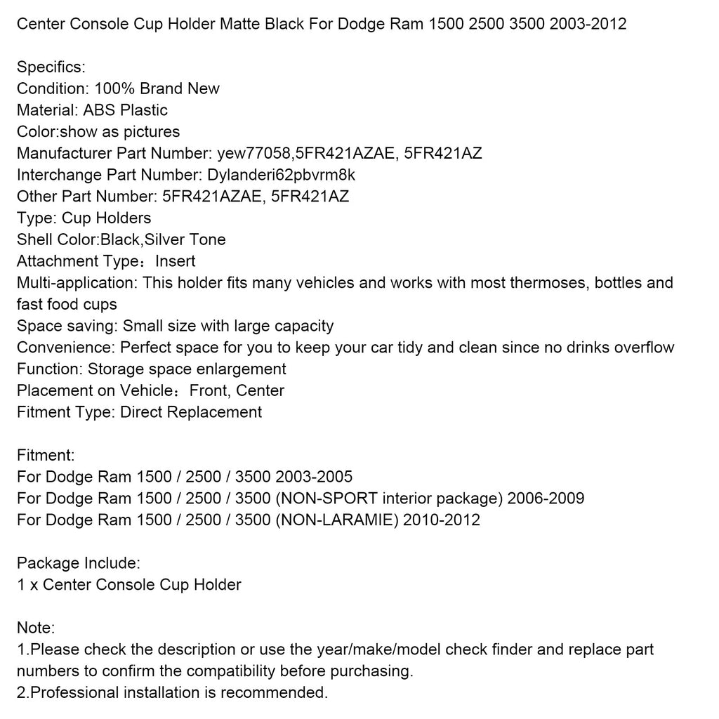 Center Console Cup Holder Matte Black For Dodge Ram 1500 2500 3500 2003-2012