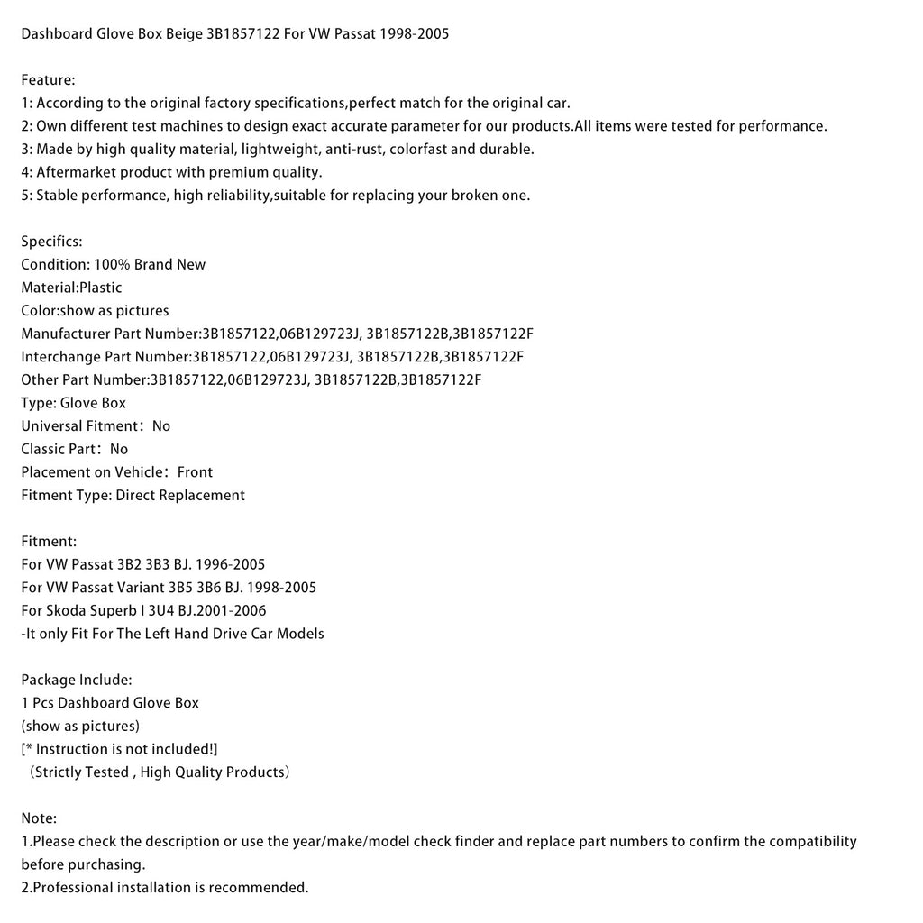 Dashboard Glove Box Beige 3B1857122 Fit For VW Passat 1998-2005