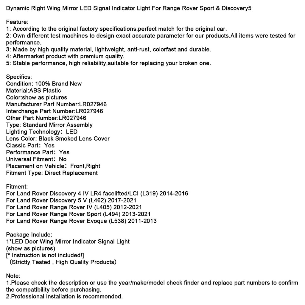 Dynamic Right Wing Mirror LED Signal Indicator Light For Range Rover Sport & Discovery5