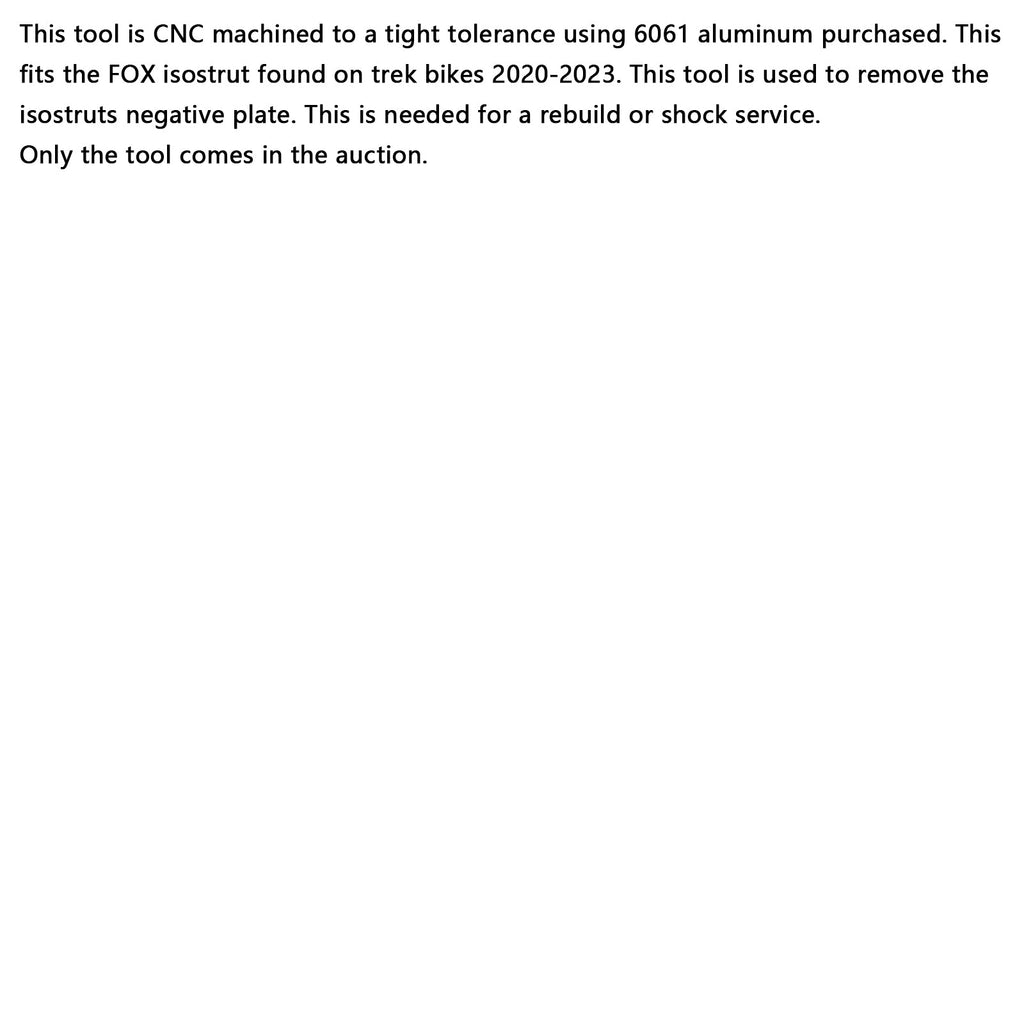 This tool is CNC machined to a tight tolerance using 6061 aluminum purchased. This fits the FOX isostrut found on trek bikes 2020-2023. This tool is used to remove the isostruts negative plate. This is needed for a rebuild or shock service.?