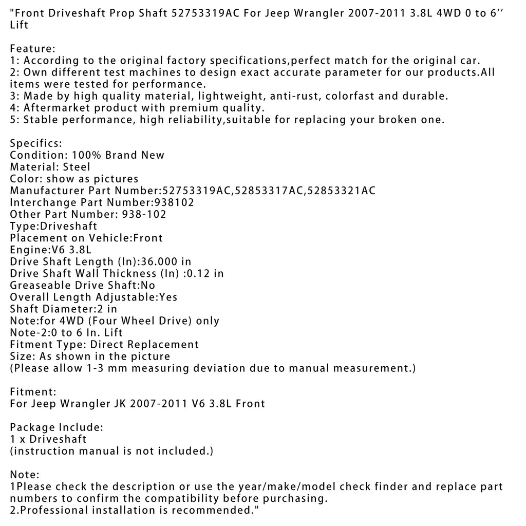 Front Driveshaft Prop Shaft 52753319AC For Jeep Wrangler 2007-2011 3.8L 4WD 0 to 6'' Lift