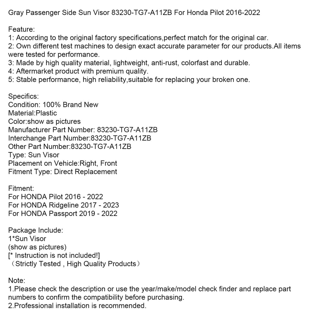 Gray Passenger Side Sun Visor 83230-TG7-A11ZB For Honda Pilot 2016-2022