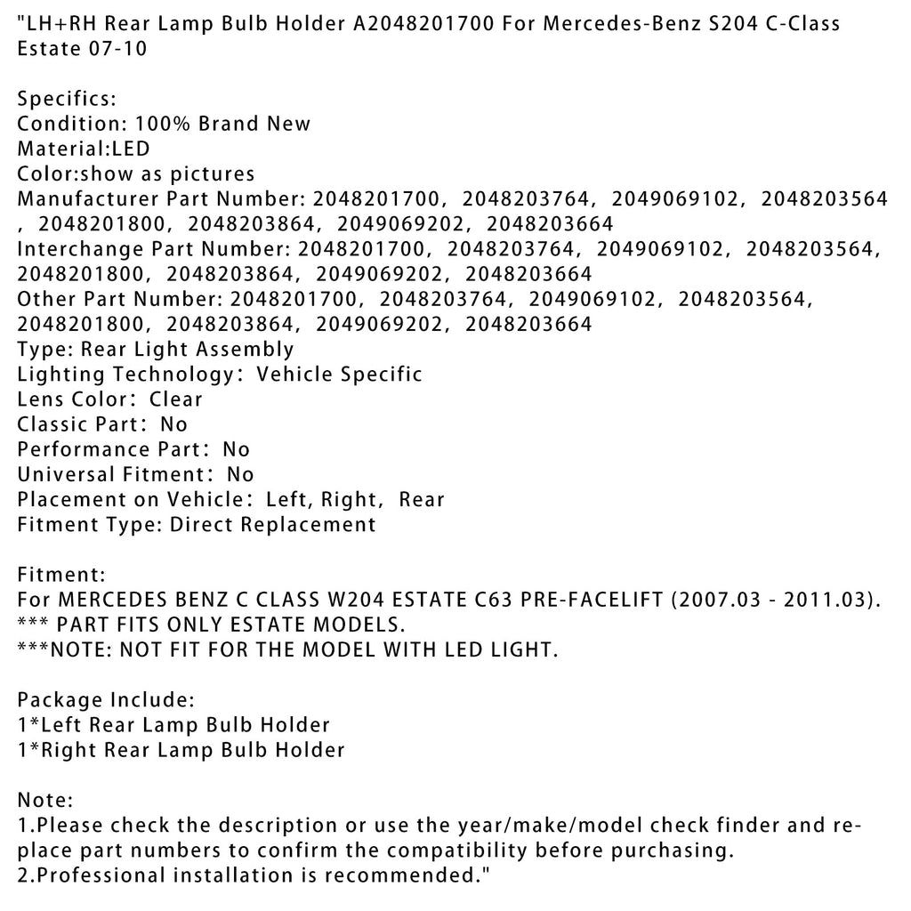 LH+RH Rear Lamp Bulb Holder A2048201700 For Mercedes-Benz S204 C-Class Estate 07-10