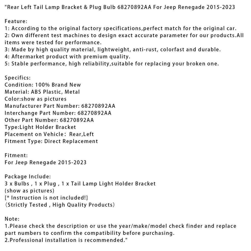 Rear Left Tail Lamp Bracket & Plug Bulb 68270892AA For Jeep Renegade 2015-2023