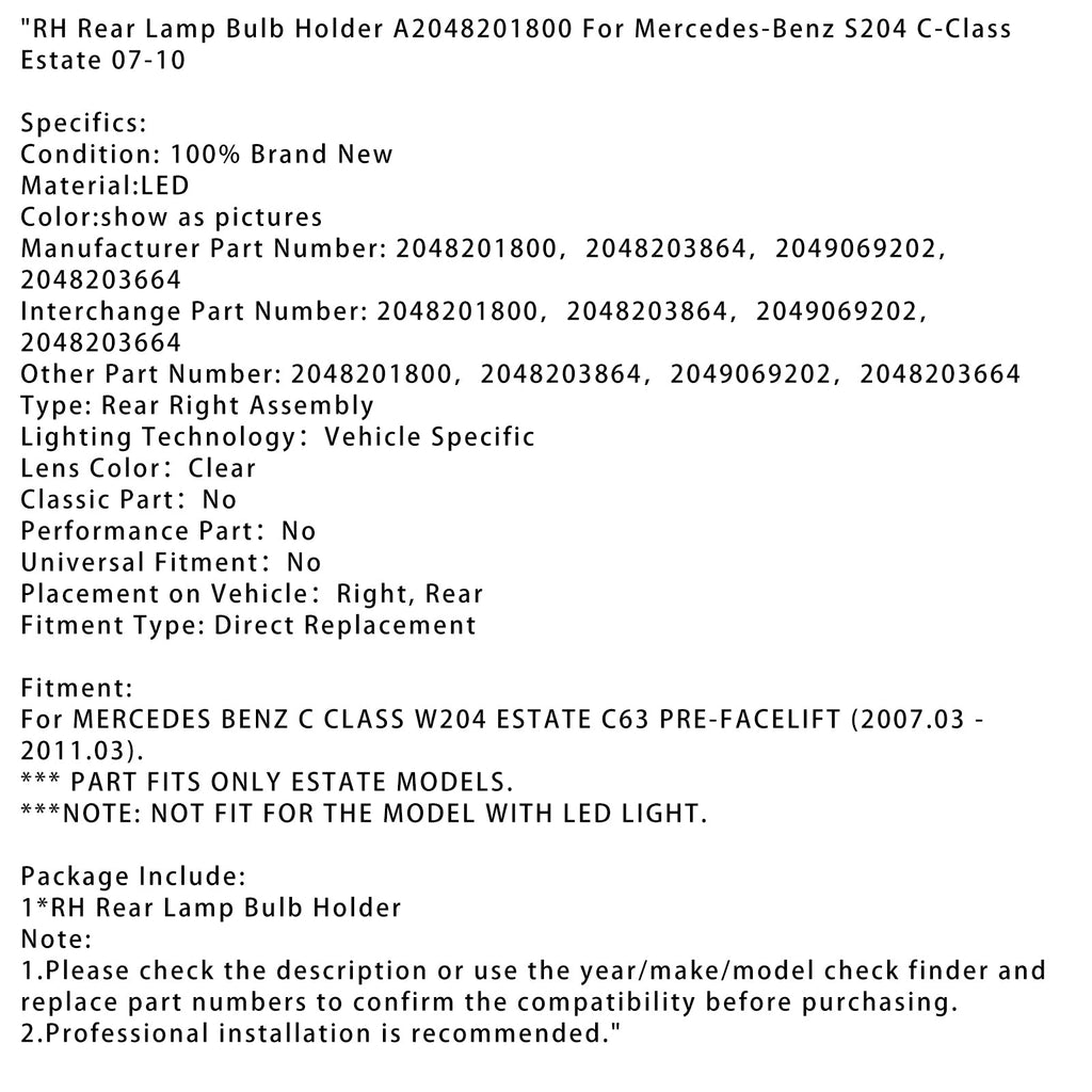 RH Rear Lamp Bulb Holder A2048201800 For Mercedes-Benz S204 C-Class Estate 07-10