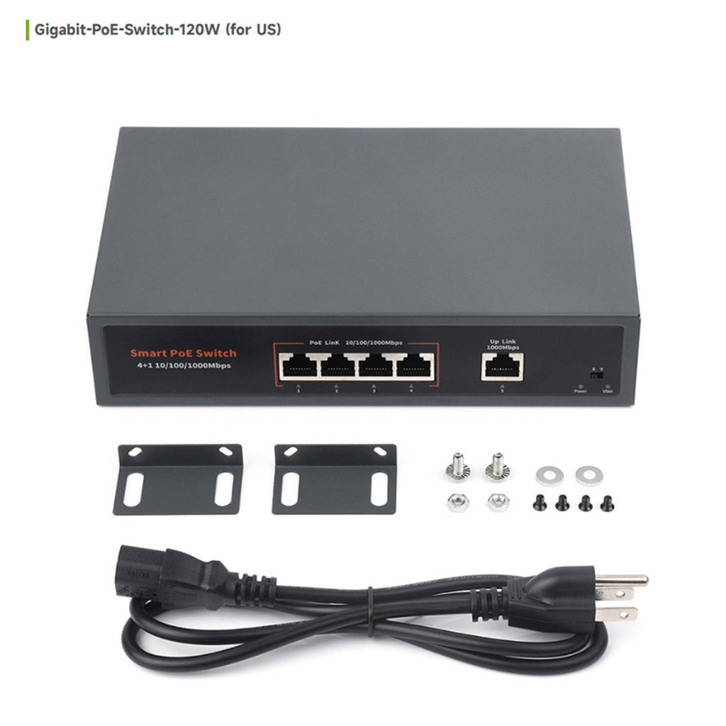 Ports: 4 10/100/1000Mbps RJ45 PoE ports, 1 10/100/1000Mbps RJ45 uplink port