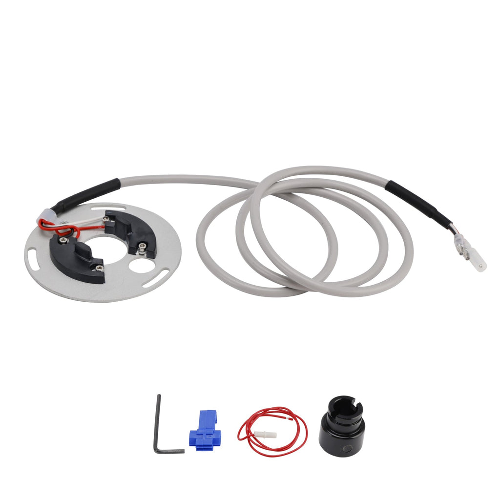 Housed behind the ignition cover and uses a magnetic rotor with the original spark advancer, so the factory advance curve is maintained.