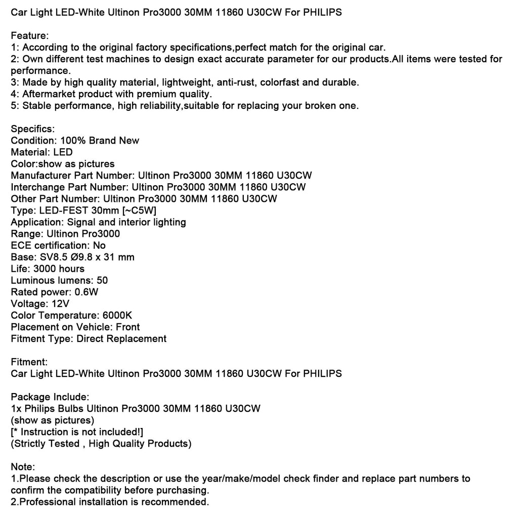 Car Light LED-White Ultinon Pro3000 30MM 11860 U30CW For PHILIPS