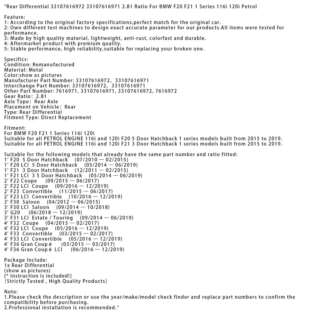 Rear Differential 33107616972 33107616971 2.81 Ratio For BMW F20 F21 1 Series 116i 120i Petrol