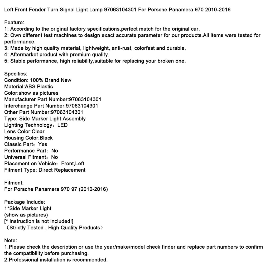 Left Front Fender Turn Signal Light Lamp 97063104301 For Porsche Panamera 970 2010-2016