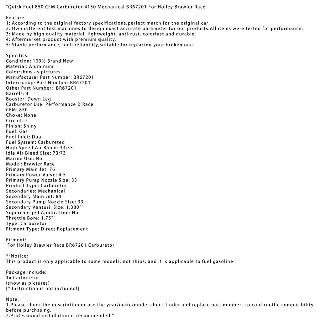 Quick Fuel 850 CFM Carburetor 4150 Mechanical BR67201 For Holley Brawler Race