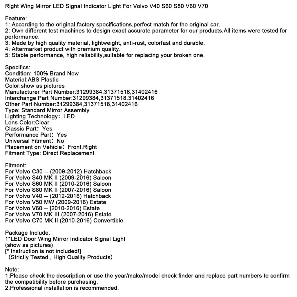 Right Wing Mirror LED Signal Indicator Light For Volvo V40 S60 S80 V60 V70