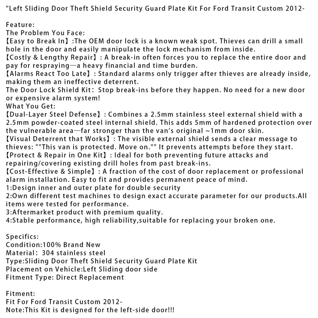 Left Sliding Door Theft Shield Security Guard Plate Kit Fit For Ford Transit Custom 2012-