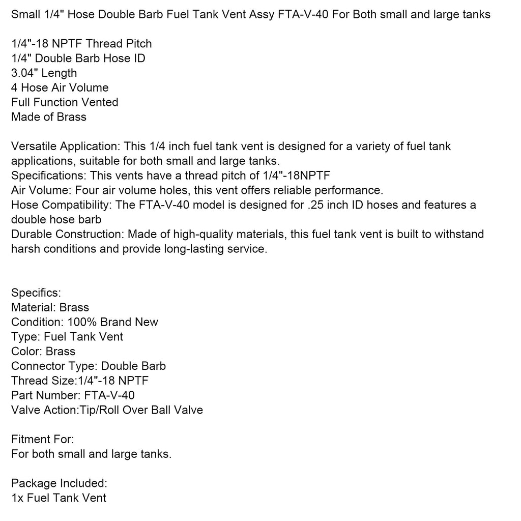 Small 1/4" Hose Double Barb Fuel Tank Vent Assy FTA-V-40 For Both small and large tanks