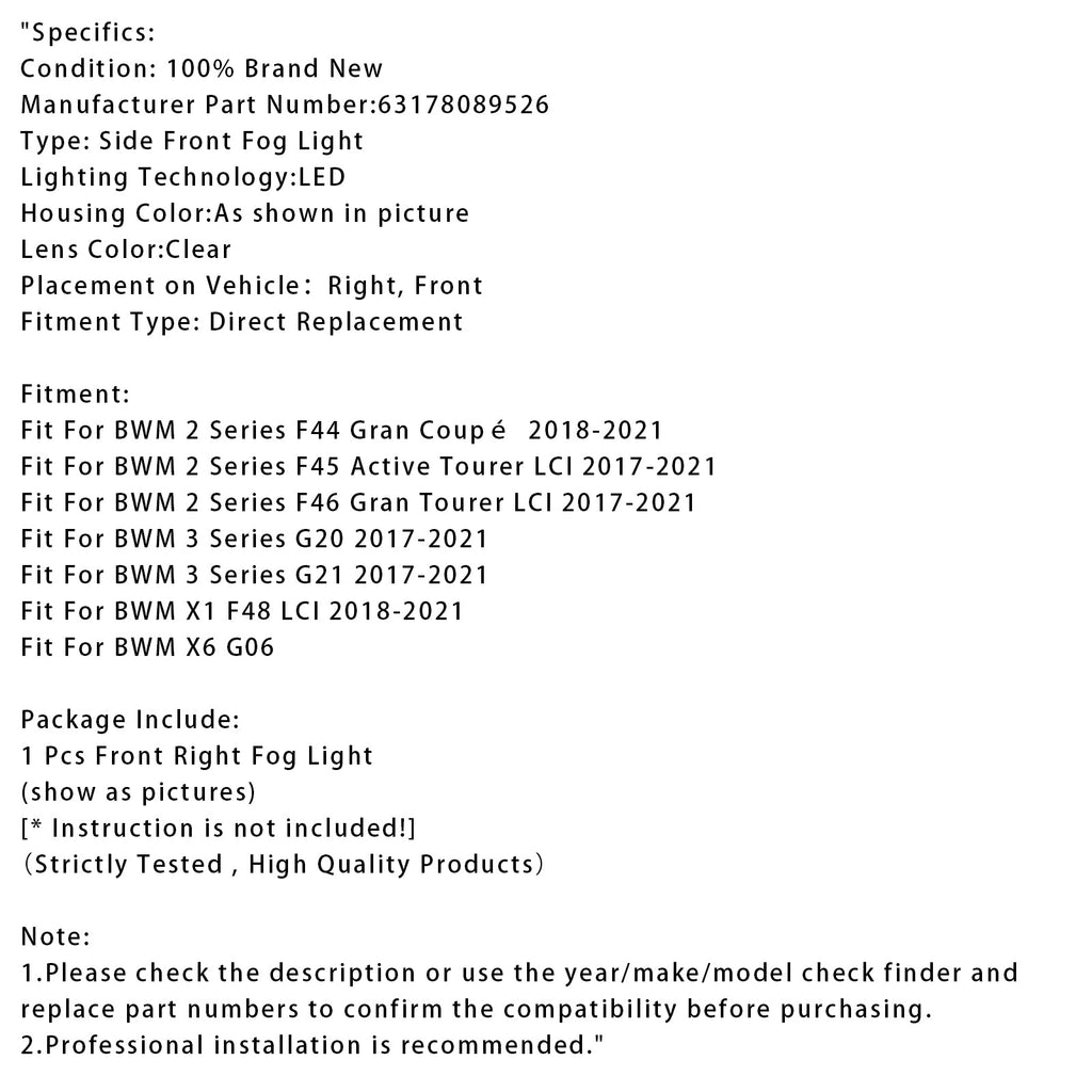1 Pcs LED Front Right Fog Light For BMW G20 G21 X1 F48 LCI F45 F46 63178089526