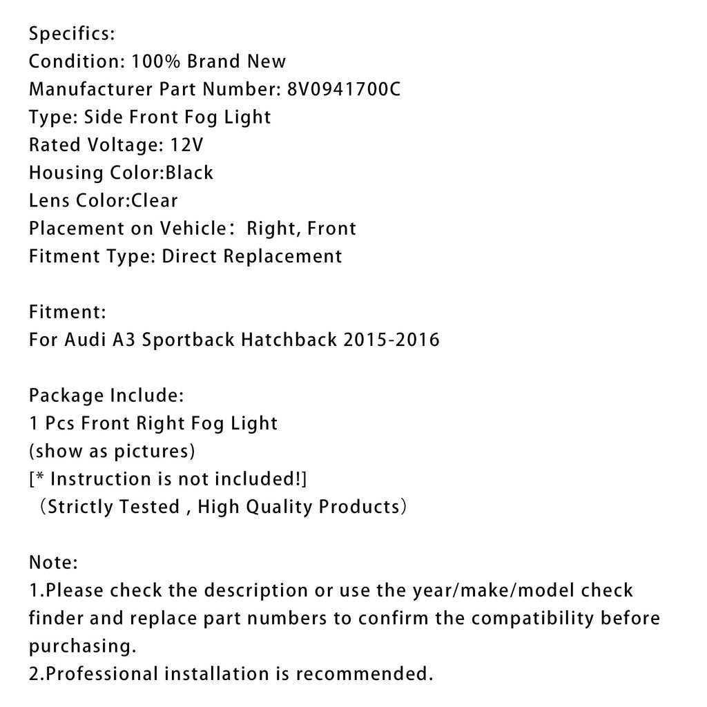 1 Pcs Front Right Fog Light Lamps With Bulbs Fit For Audi A3 Sportback 8V0941700C 2015-2016