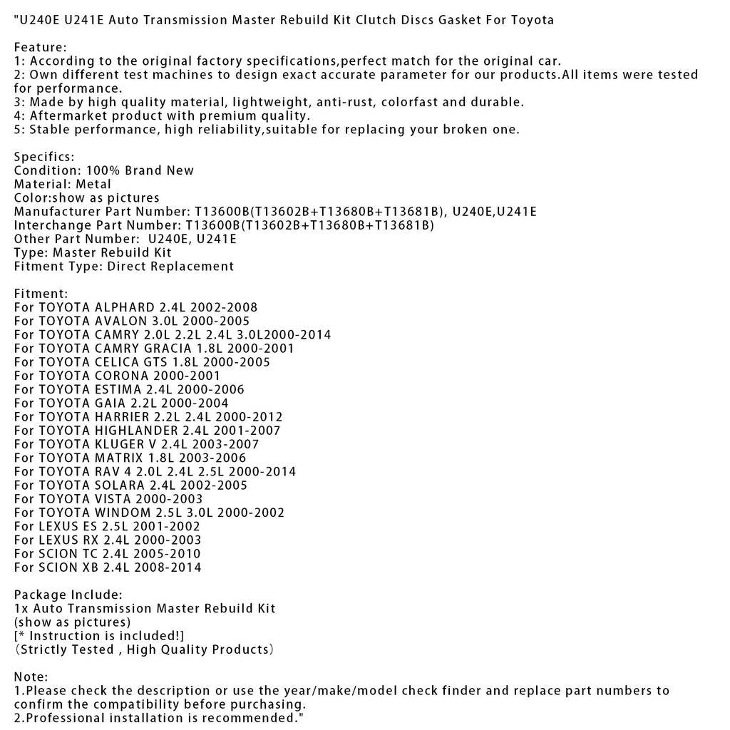 2000-2014 TOYOTA CAMRY 2.0L 2.2L 2.4L 3.0L Auto Transmission Master Rebuild Kit Clutch Discs Gasket T13600B U240E U241E