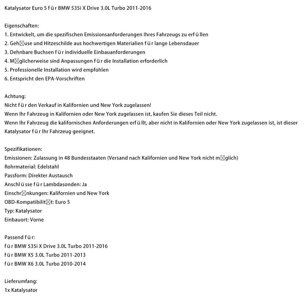 Catalytic Converter Euro 5 Fit For BMW 535i X Drive 3.0L Turbo 2011-2016