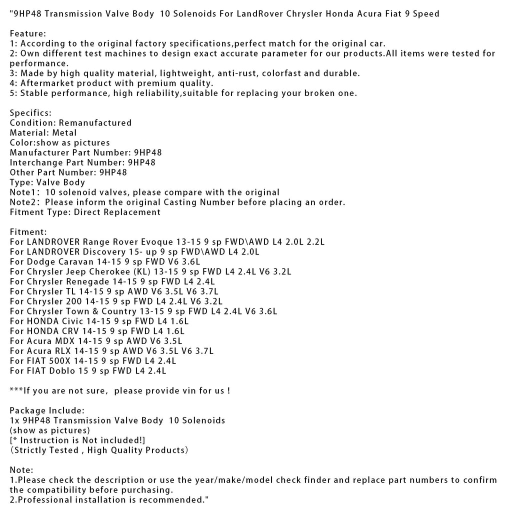 9HP48 Transmission Valve Body 10 Solenoids Fit For LandRover Chrysler Honda Acura Fiat 9 Speed