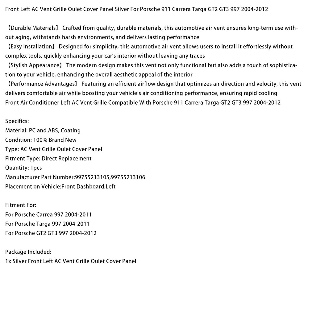 Front Left AC Vent Cover Silver For Porsche 911 Carrera Targa 997 2004-2012 99755213105 99755213106