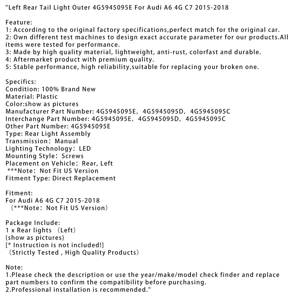 Left Rear Tail Light Outer 4G5945095E For Audi A6 4G C7 2015-2018