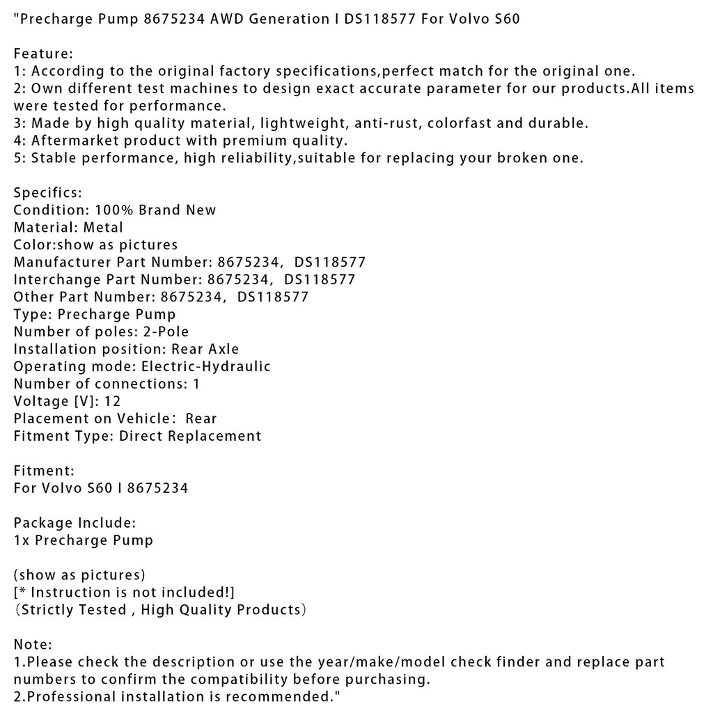 Precharge Pump 8675234 AWD Generation I DS118577 For Volvo S60