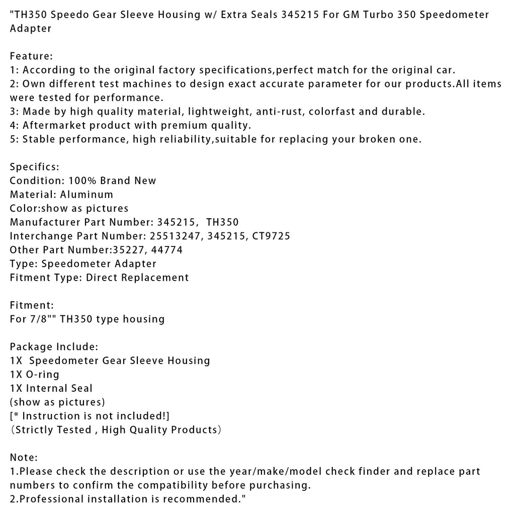 TH350 Speedo Gear Sleeve Housing w/ Extra Seals 345215 For GM Turbo 350 Speedometer Adapter