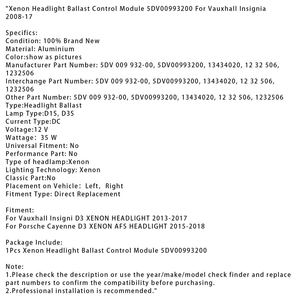 2013-2017 Vauxhall Insigni D3 XENON HEADLIGHT Xenon Headlight Ballast Control Module 5DV00993200