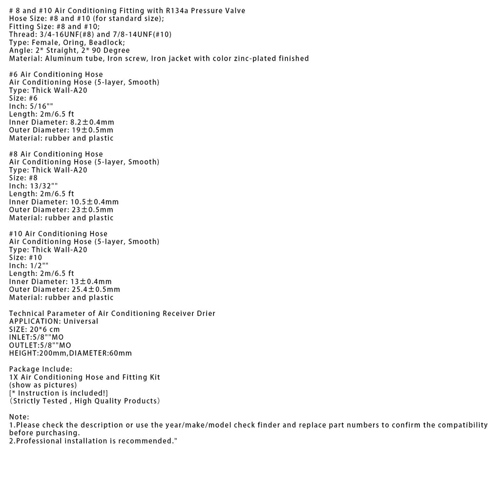 3.Item Inludes: 1 PC #6 AC Hose, 1 PC #8 AC Hose, 1 PC #10 AC Hose, 3 PCS #6 AC Fittings(Straight), 3 PCS #6 AC Fittings(90 Degree), 3 PCS #8 AC Fittings(Straight), 3 PCS #8 AC Fittings(90 Degree), 3 PCS #10 AC Fittings(Straight), 3 PCS #10 AC Fittings(90 Degree), 1 PC #8 AC Fitting with R134a Valve(Straight), 1 PC #10 AC Fitting with R134a Valve(Straight), 1 PC #8 AC Fitting with R134a Valve(90 Degree), 1 PC #10 AC Fitting with R134a Valve(90 Degree), 1PC AC Receiver Drier, 4 PCS Oring Seals for #6 Fitting(6.8*19mm), 4 PCS Oring Seals for #8 Fitting(10.8×2.4mm), 4 PCS Oring Seals for #10 Fitting(13.8×2.4mm)
