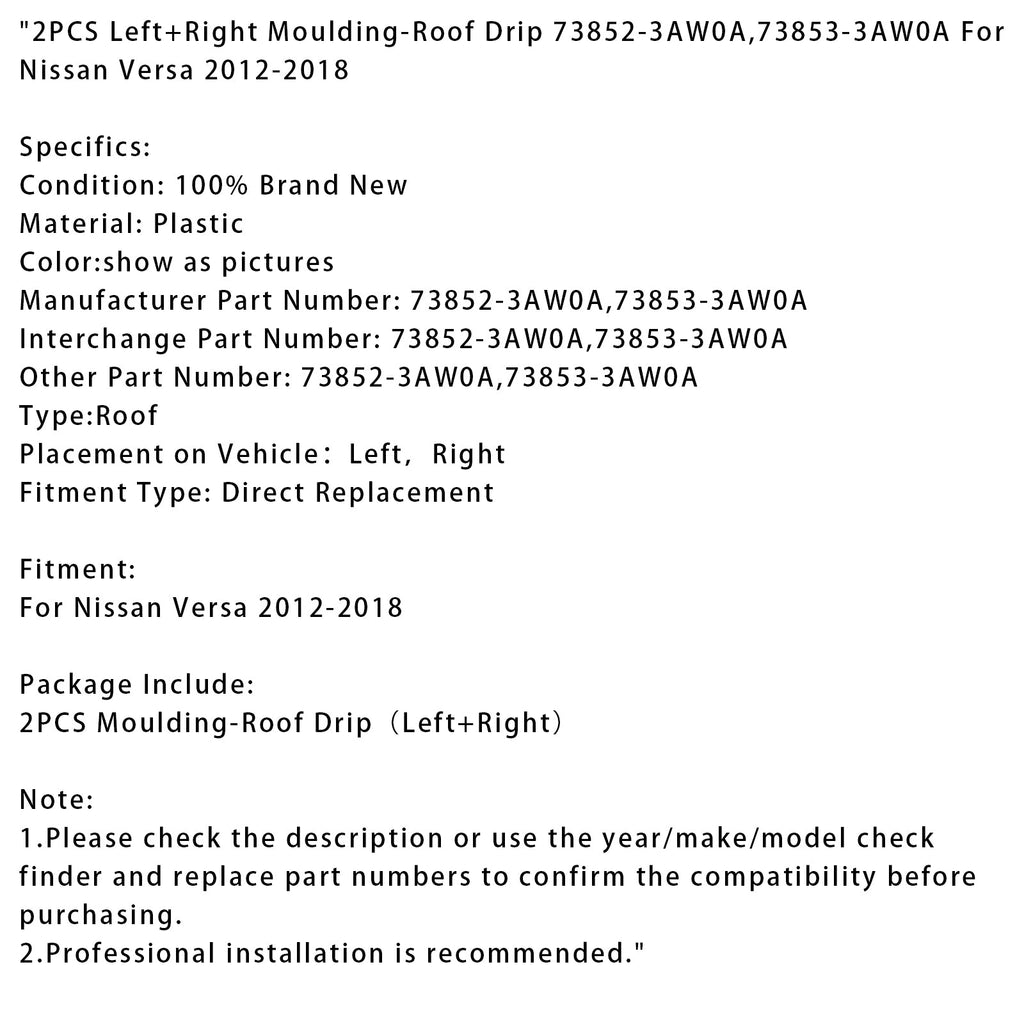 2PCS Left+Right Moulding-Roof Drip 73852-3AW0A,73853-3AW0A For Nissan Versa 2012-2018