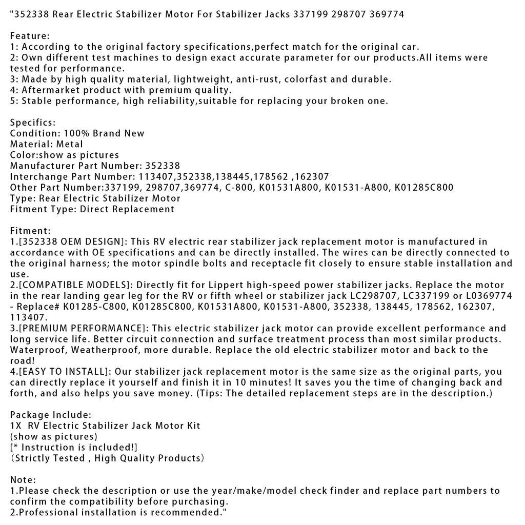 2.[COMPATIBLE MODELS]: Directly fit for Lippert high-speed power stabilizer jacks. Replace the motor in the rear landing gear leg for the RV or fifth wheel or stabilizer jack LC298707, LC337199 or L0369774 - Replace# K01285-C800, K01285C800, K01531A800, K01531-A800, 352338, 138445, 178562, 162307, 113407.