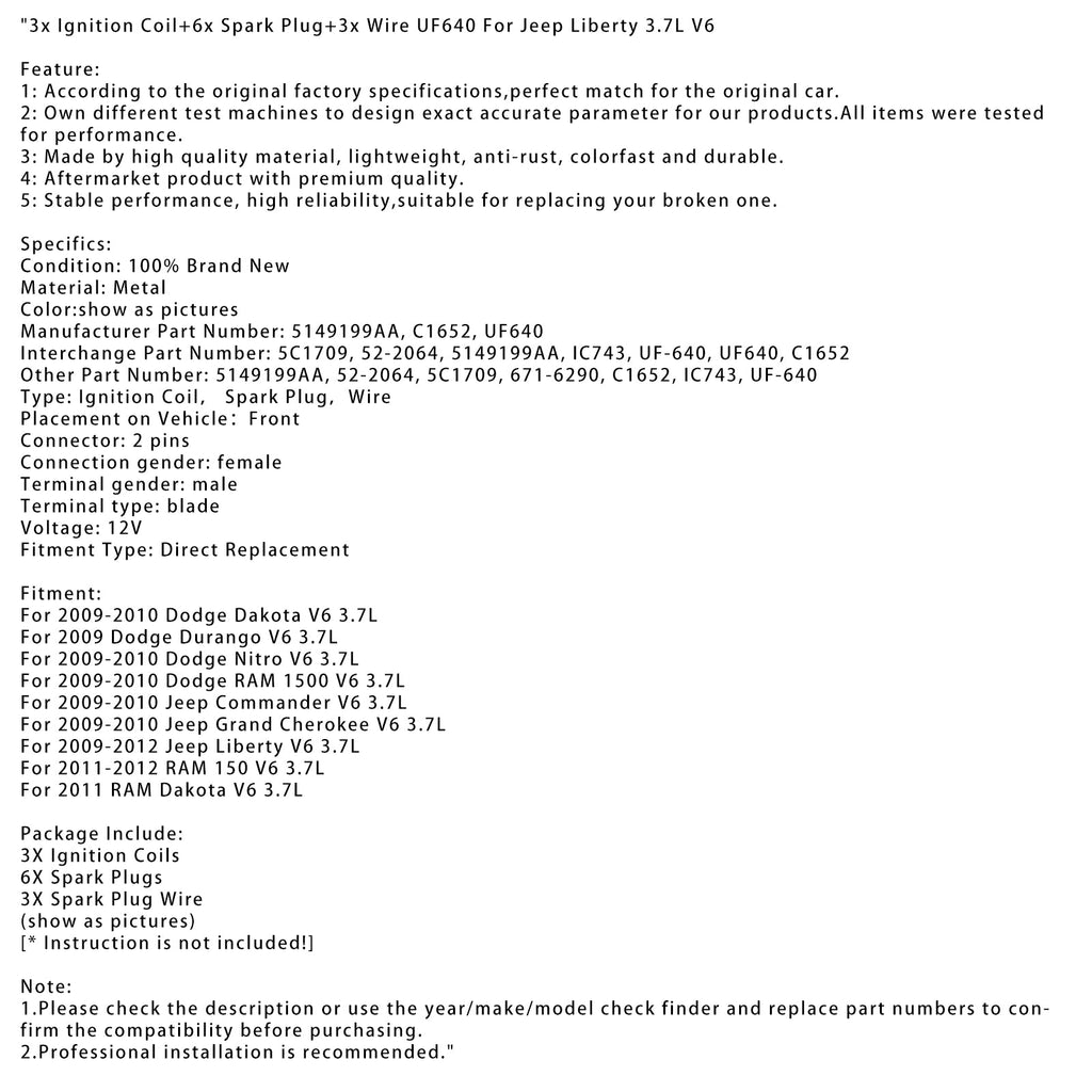 3x Ignition Coil+6x Spark Plug+3x Wire UF640 For Jeep Liberty 3.7L V6