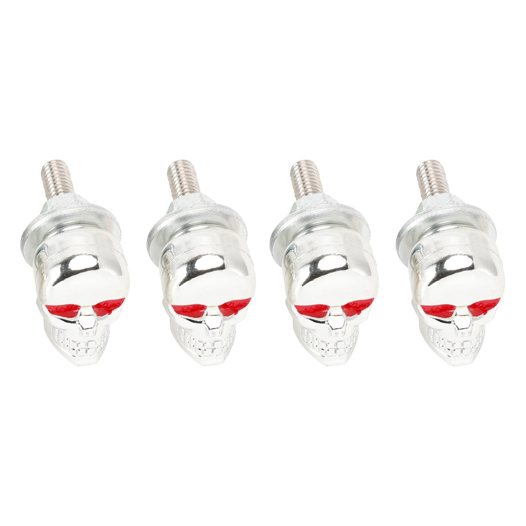 Bolts with red eyes skull design for mounting on license plates.