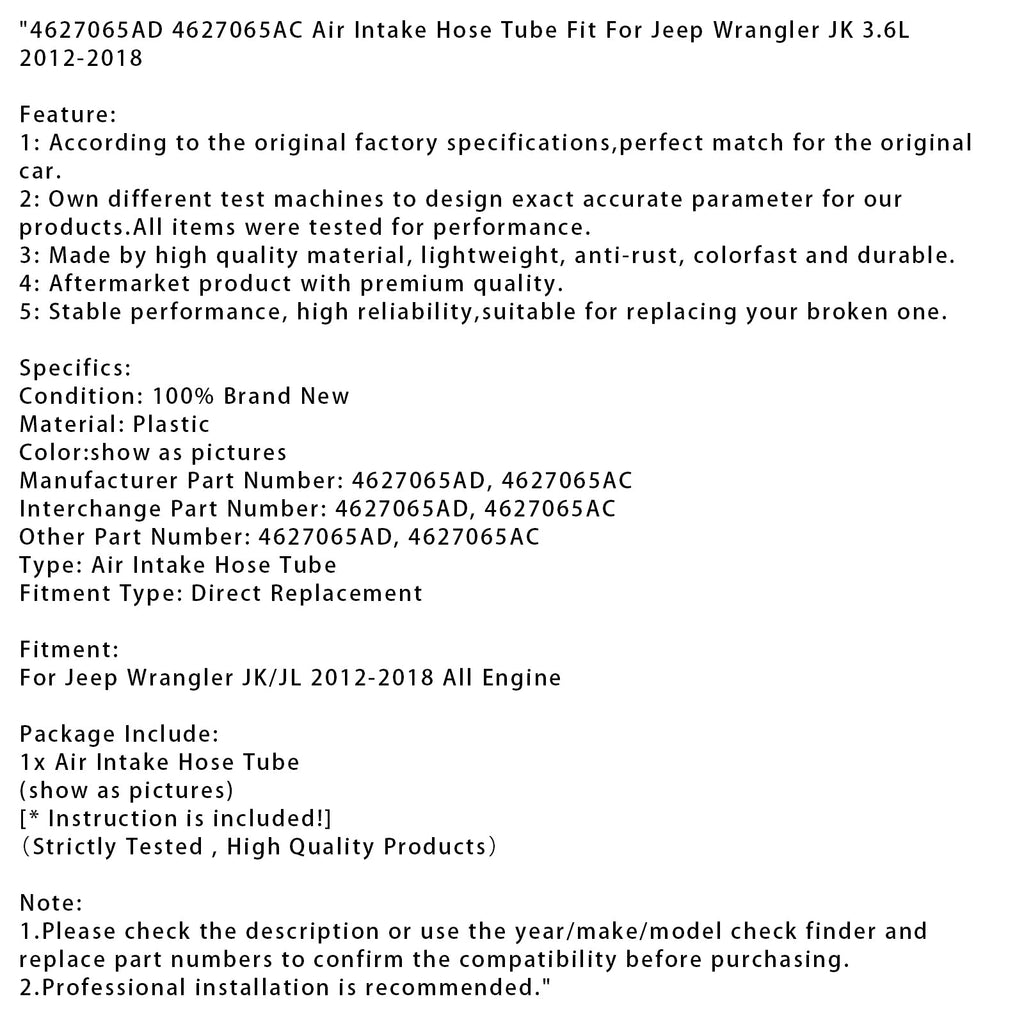 4627065AD 4627065AC Air Intake Hose Tube Fit For Jeep Wrangler JK 3.6L 2012-2018