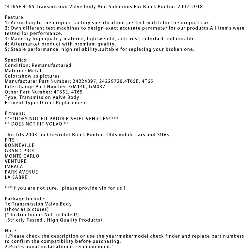 4T65E 4T65 Transmission Valve body And Solenoids Fit For Buick Pontiac 2002-2018