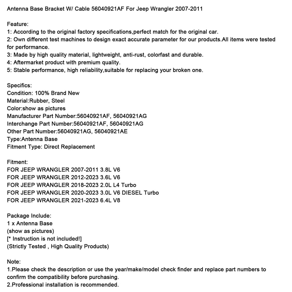 Antenna Base Bracket W/ Cable 56040921AF For Jeep Wrangler 2007-2011
