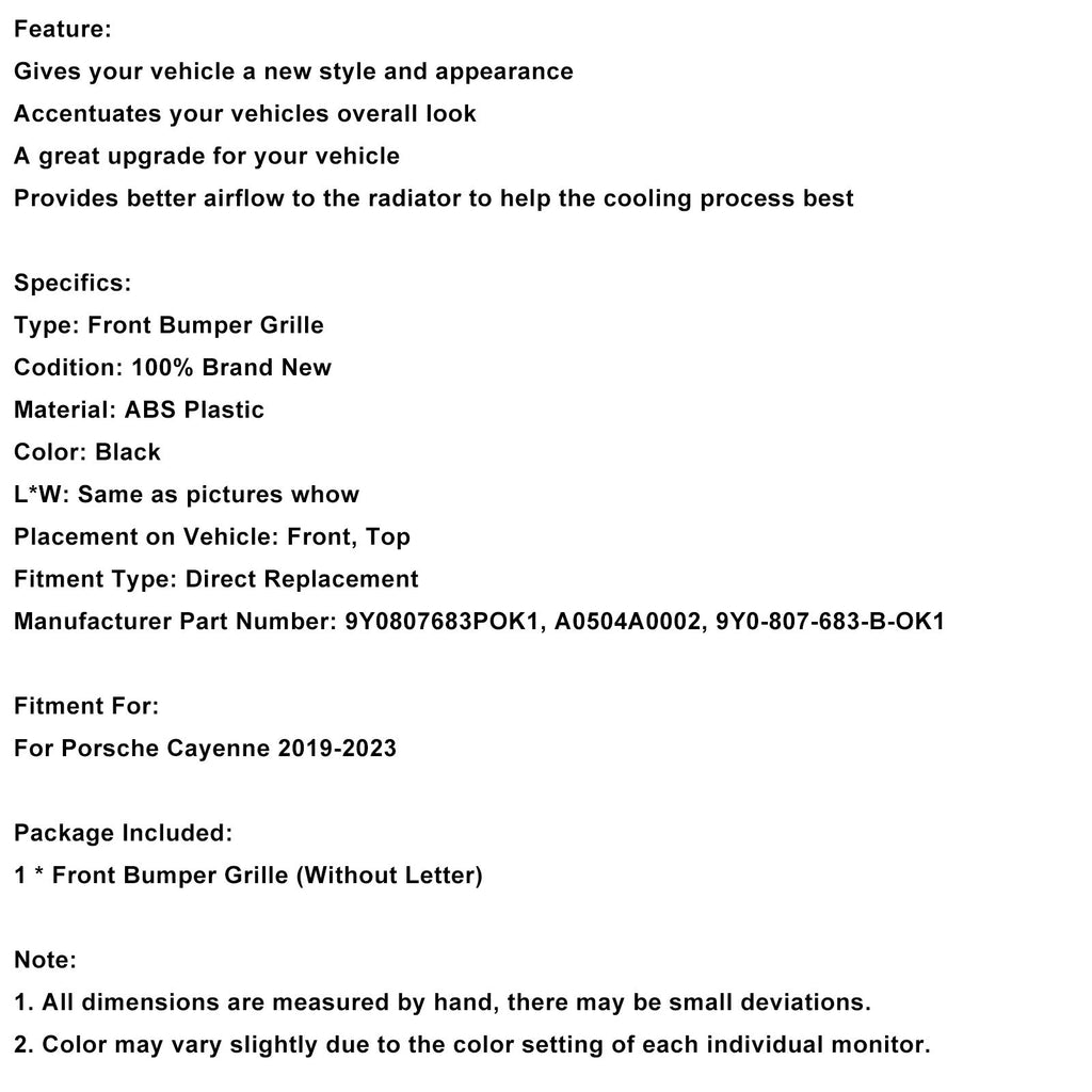 Black Front Bumper Grill Grille 9Y0807683POK1 Fit Porsche Cayenne 2019-2023