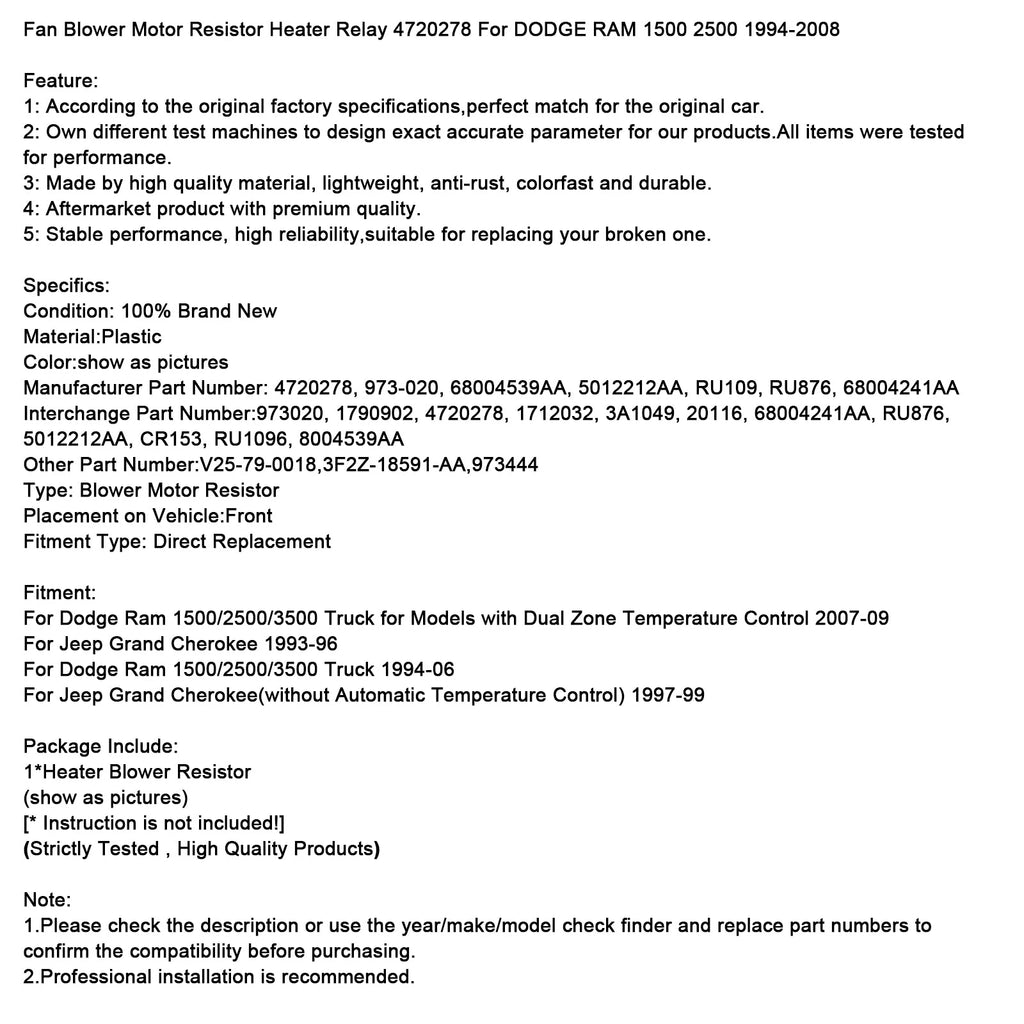 Fan Blower Motor Resistor Heater Relay 4720278 For DODGE RAM 1500 2500 1994-2006